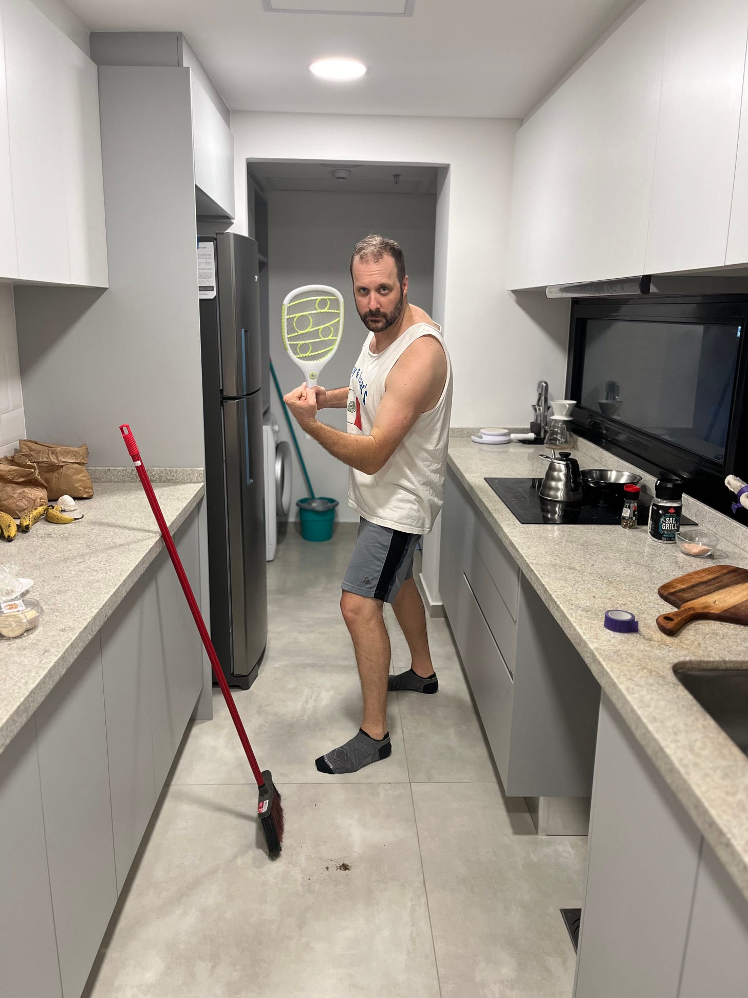 I'm swatting in my undies because it's 100 degrees and humid and we don't have an air con in the kitchen where the insects are congregating. I'm worried I'll catch a knee or a hip on a misplaced followthrough and the current will split my leg right open like a well crisped chorizo. It'll hurt like hell, and I don’t know how electrocution works, but this thing has so much juice I’m pretty sure it’ll sterilize me, and in a country where women have basically no reproductive rights, maybe it’ll all be part of God’s plan, if that’s how that whole thing works.